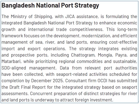 バングラデシュ国家港湾戦略は、同国海運省が初めて策定する総合港湾政策で、2025年末に海港編案を政府に提出、引き続き、河川港編・陸港編の策定作業中です。JICAはこの策定作業を支援しています(OCDI受注)。本取組は、暫定政権の総括文書に記載され、新政権に引き継がれるものと期待されます。